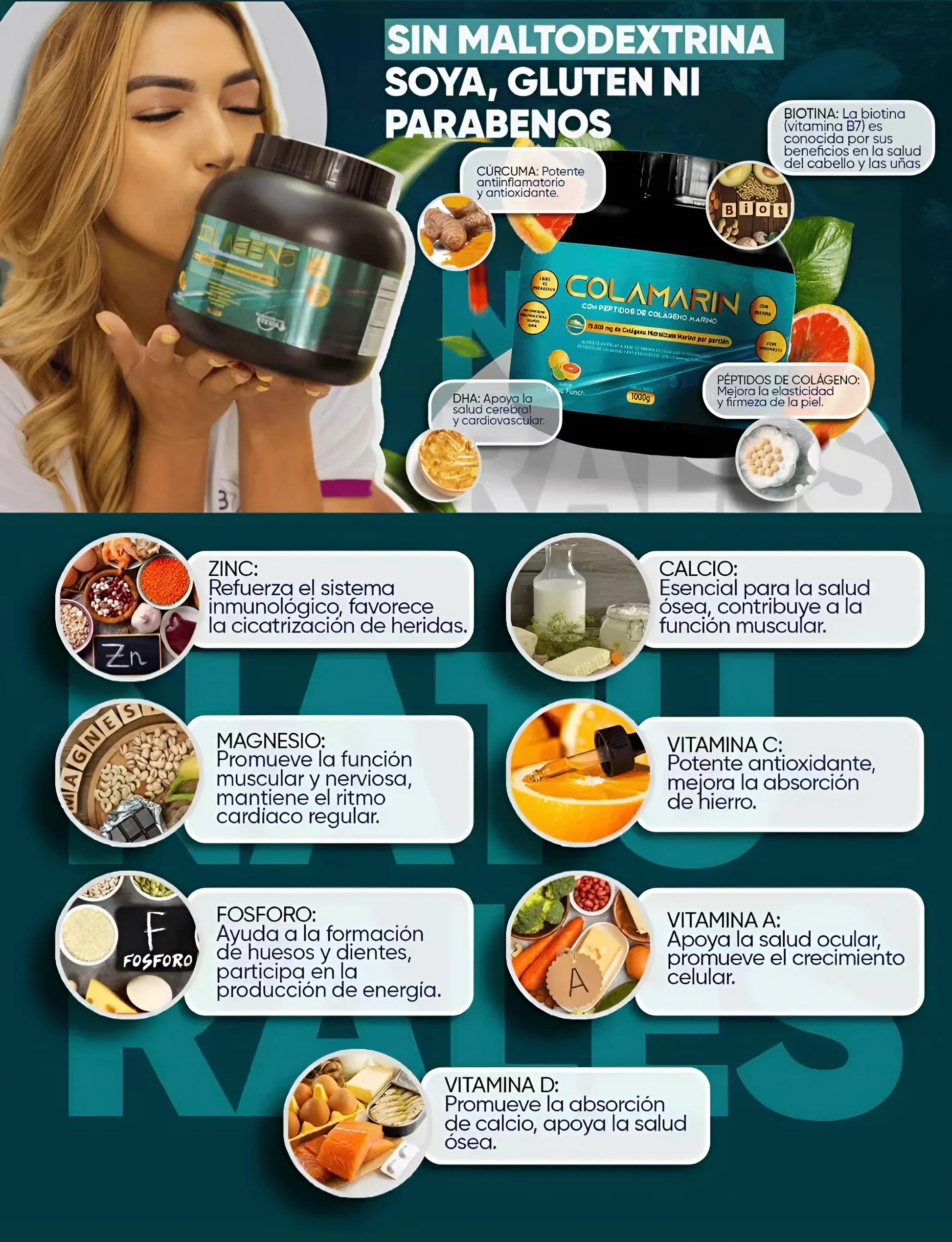 ◾ Completo y Versátil: Contiene nutrientes esenciales que regeneran la piel, articulaciones, huesos, cabello y uñas.